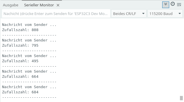 In einem ersten Schritt soll eine kurze Textnachricht von einem ESP32 an einen anderen ESP32 gesendet werden. Der Text enthält eine zufällig erzeugte Zahl.