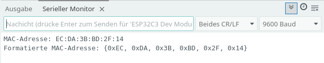 Das Programm ermittelt die MAC-Adresse und zeigt sie im Seriellen Monitor an. Die formatierte MAC-Adresse kannst du anschließend kopieren und direkt in den Programmen verwenden.