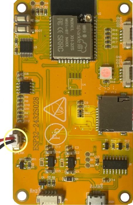 Ein Lautsprecher wird mit einem Mikro JST-Stecker mit 2 Pins angeschlossen. Die Lautstärke kann mit Hilfe eine Widerstands an einem der Drähte reduziert werden.