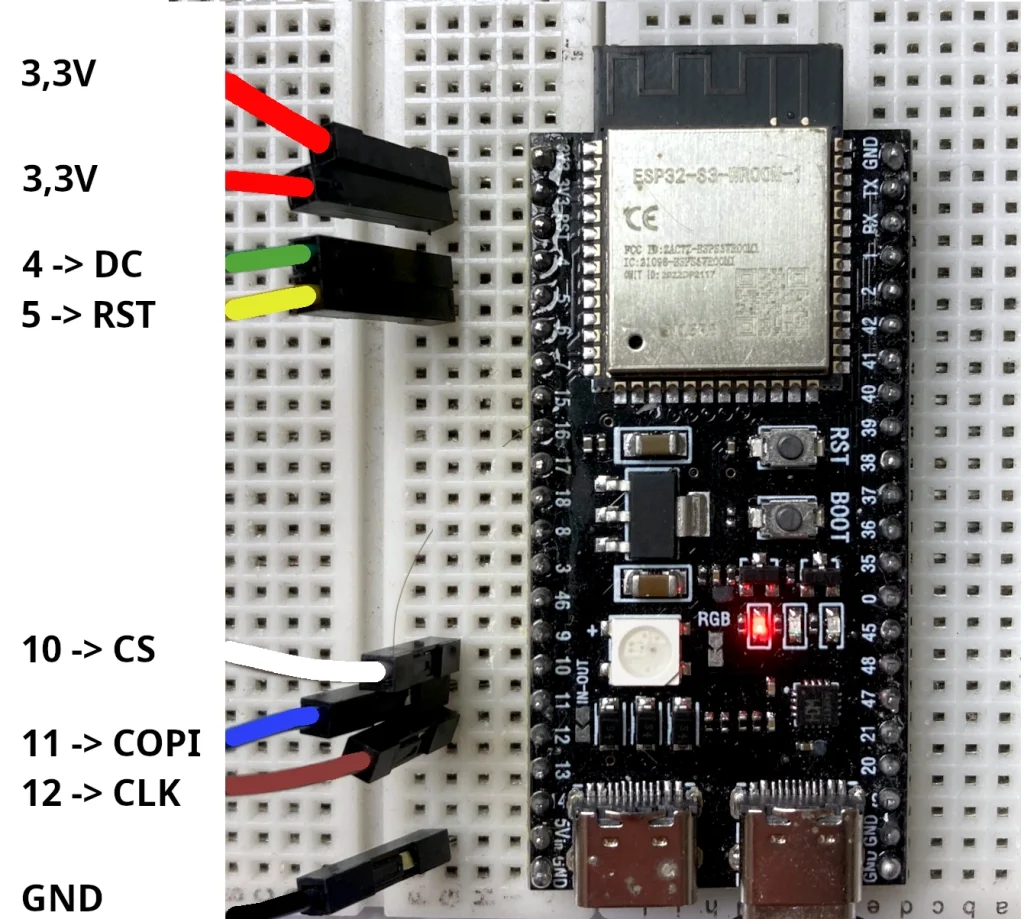 Der ein­zi­ge Unter­schied zwi­schen den Mikro­con­trol­lern ist die Zuord­nung der SPI-Pins (im Bei­spiel ESP32-WROOM).