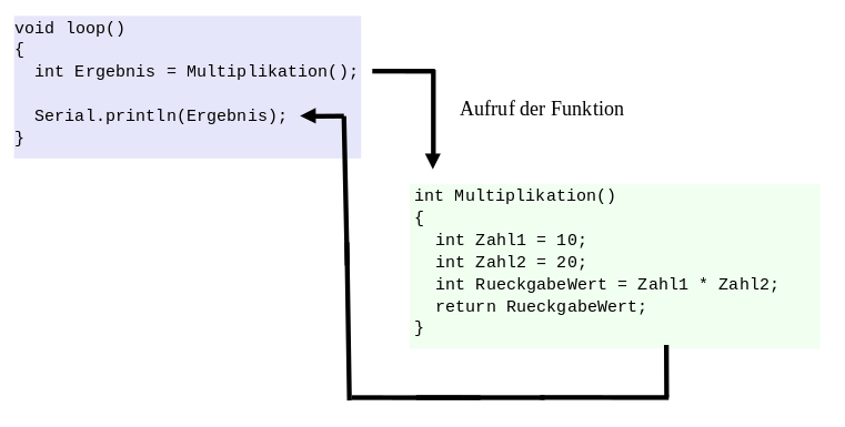 Die Funktion mit einem Rückgabewert besteht aus der Deklaration des Typs der Variablen (int, float, bool, String), die zurückgegeben wird, optional einer oder mehrere durch Kommata getrennte Variablen, die der Funktion übergeben werden und den Anweisungen.