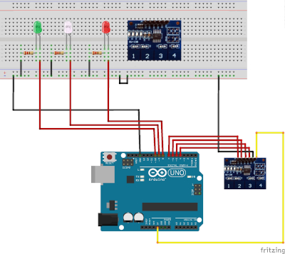 Die Tasten 1 bis 3 des 4-Tasten Berührungssensors sollen bei der ersten Berührung die LEDs einschalten, bei einer erneuten Berührung wird die jeweilige LED wieder ausgeschaltet.